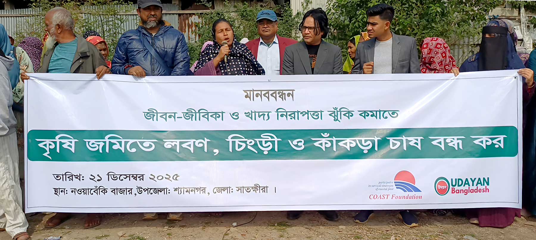 Speakers raised these demands at a human chain held at Nawabenki Bazar in Shyamnagar Upazila of Satkhira district on December 21, 2025. COAST Foundation and Udayan Bangladesh jointly organized this human chain. Head of Climate Change of COAST Foundation, Mr. M.A. Hasan, moderated this event, which was presided over by Mr. Sheikh Asad, Executive Director of Udayan Bangladesh. Among others, —– and others spoke at this human chain.