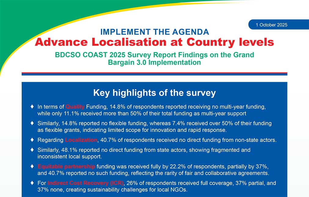 BDCSO COAST is a network of local and national NGOs in Bangladesh that became a signatory to the Grand Bargain in March 2025. As part of the 2025 yearly reporting process to track the progress of localization in the country, the network launched a survey to capture the real-time status of the Grand Bargain Agenda. The survey reveals significant gaps in funding, localization, participation, gender responsiveness, risk-sharing, and anticipatory action. To know more, please find the full report click here