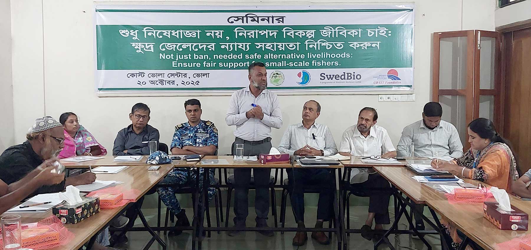 Bhola, 20 October 2025: Today, COAST Foundation organized a seminar at the COAST Bhola Center, Bhola Sadar, Bhola, titled “Sustainable Livelihood and Skill Development are the Keys to Secure Small-scale Fishers Beyond Temporary Support”. The seminar was moderated by Sanat Kumar Bhowmik, Deputy Executive Director, COAST Foundation. It was presided over by Mobasshir Ullah Chowdhury, Member, General Council, COAST Foundation. Md. Iqbal Hossain, District Fisheries Officer, Bhola, attended as the Chief Guest. Apart from that, representatives from the Bhola Press Club, Coast Guard, Police Administration, Panel Chairman of Dhania Union Parishad, journalists, and fisher leaders participated in the discussion.