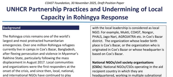 Like several other local partners previously supported by UNHCR, COAST has made significant contributions to the response since 2018, particularly in promoting social cohesion. COAST co-founded and has been leading the Cox’s Bazar CSO-NGO Forum (CCNF – www.cxb-cso-ngo.org), a coalition of local NGOs working to ensure that humanitarian response strategies are inclusive and respectful of both refugee and host community needs. Over the last eight years, COAST and CCNF have organized multiple advocacy campaigns and dialogues, without external donor funding, to promote Rohingya refugee rights at district, national, and regional levels, which is also consistent with the core principles of UNHCR’s mandate. COAST has also continuously engaged media and civil society to keep the issue visible and uphold a rights-based humanitarian approach. Some of the events are-